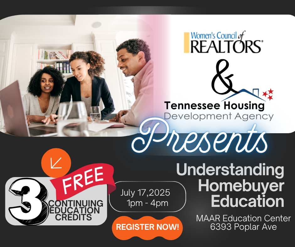 Join the Women's Council of REALTORS® and THDA to sharpen your skills! Learn about THDA DPA homebuyer education requirements and network with pros! Earn THREE free hours of CE credit and enjoy light refreshments. Claim your spot now!